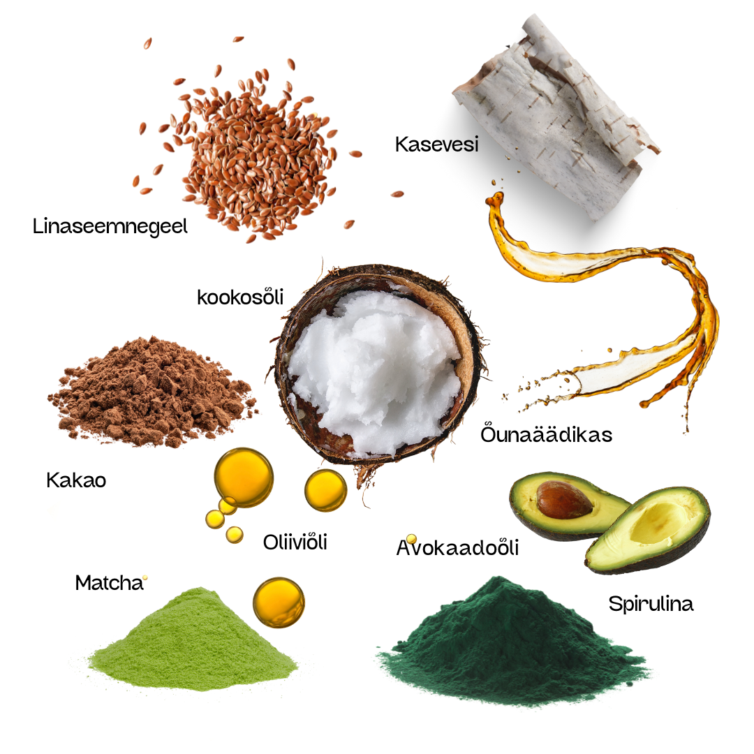 - Spirulina, matcha ja kakao annavad antioksüdantse toime ning loodusliku tooni