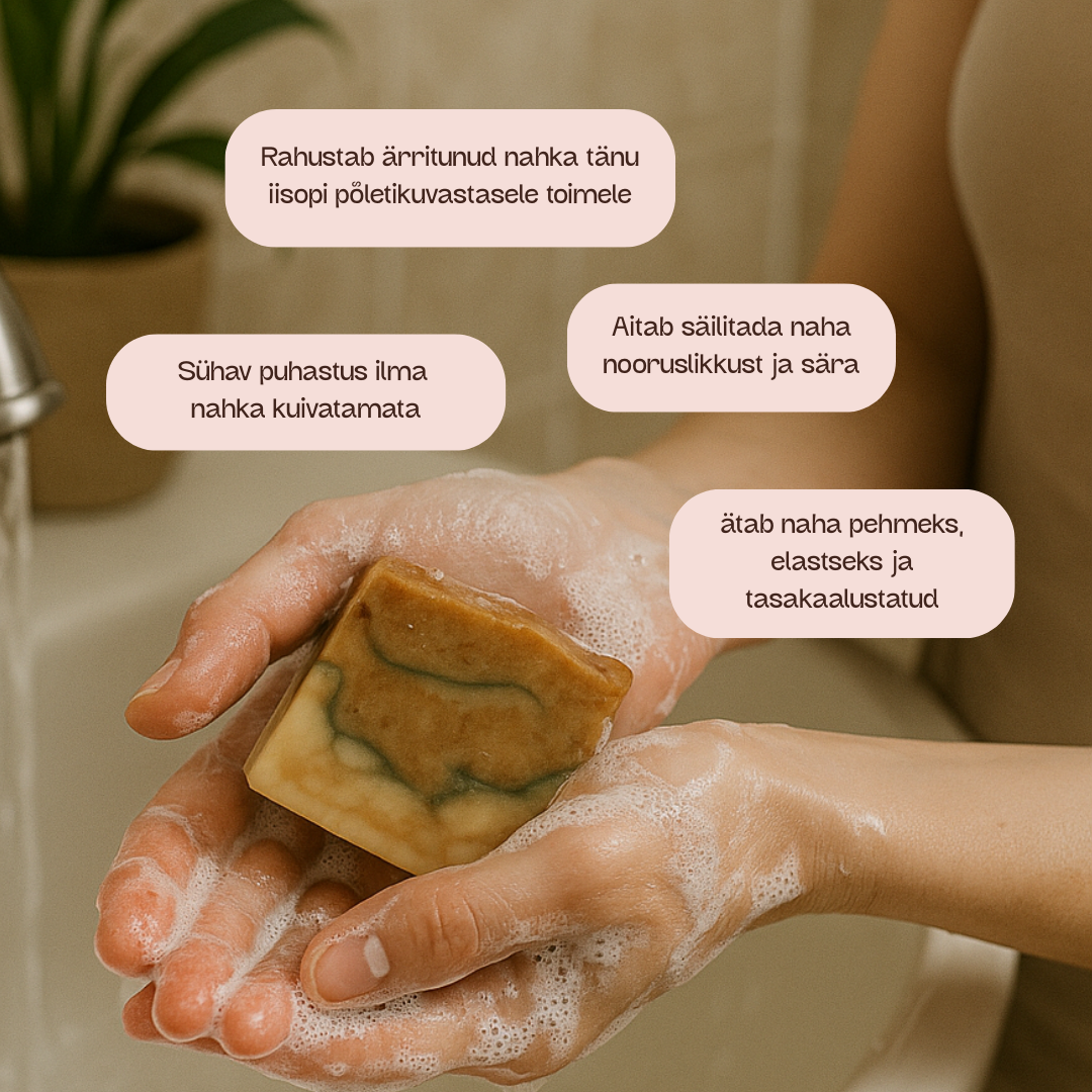 Orrawa puhastav käsitööseep toob iisopi väe sinu igapäevasesse nahahooldusesse. Valmistatud looduslikest ja mahedatest koostisosadest, mille koosmõju rahustab nahka, puhastab õrnalt ja toetab selle loomulikku kaitsevõimet.
