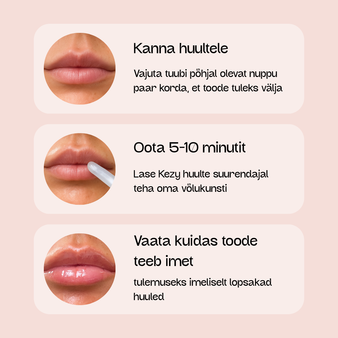 Pumpa tuubi põhjal olevast nupust välja natuke toodet. Kanna toode aplikaatoriga huultele ja lase 5-10 minutit mõjuda.