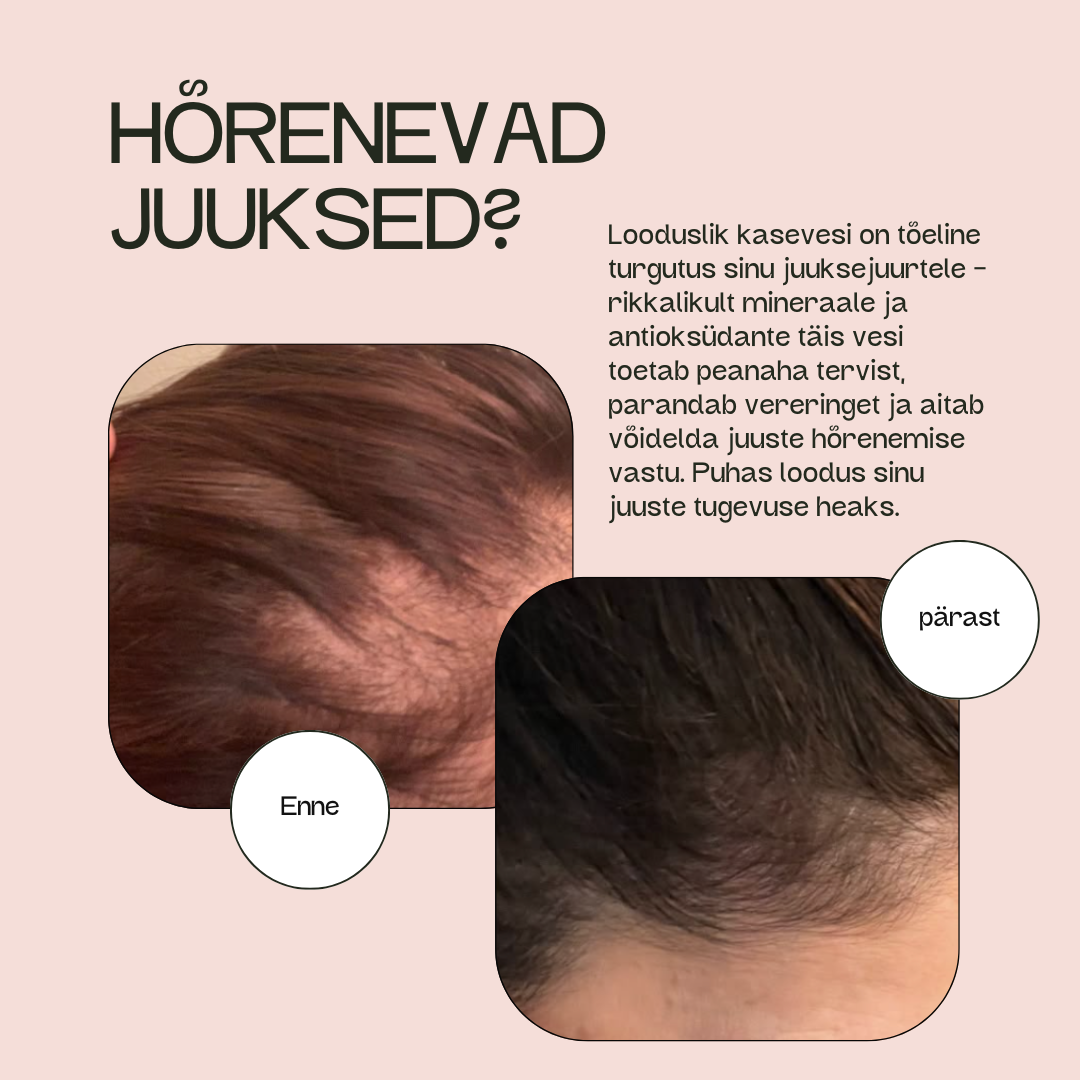 Näol – pihusta otse näole või kanna vatipadjaga. Lase loomulikult imenduda. Kasevesi sisaldab looduslikke mineraale ja betuliini, mis aitavad taastada naha loomuliku kaitsekihi. Kase pehmevesi puhastab ja ahendab poore, jättes naha samal ajal niisutatuks ja siidiselt pehmeks. Põhimõtteliselt nagu toonik – aga parem.
